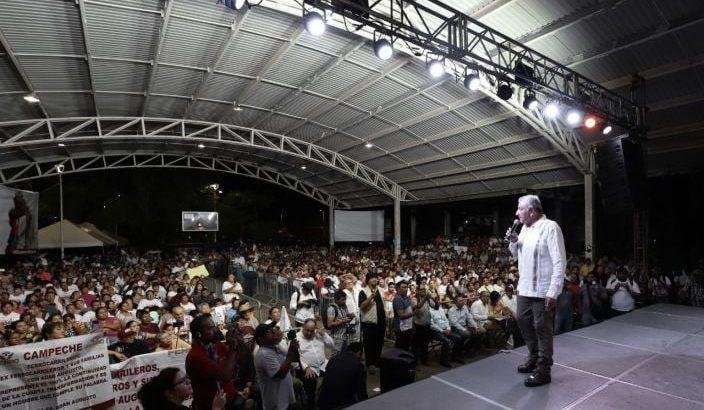 Mencionó que en Carmen, un par de horas antes, fue su asamblea número 100 desde que inicio su gira, y que esa asamblea se la dedicó a los campechanos, pues agradeció infinitamente la presencia de las más de mil personas presentes aún cuando ya de vislumbraba la lluvia.