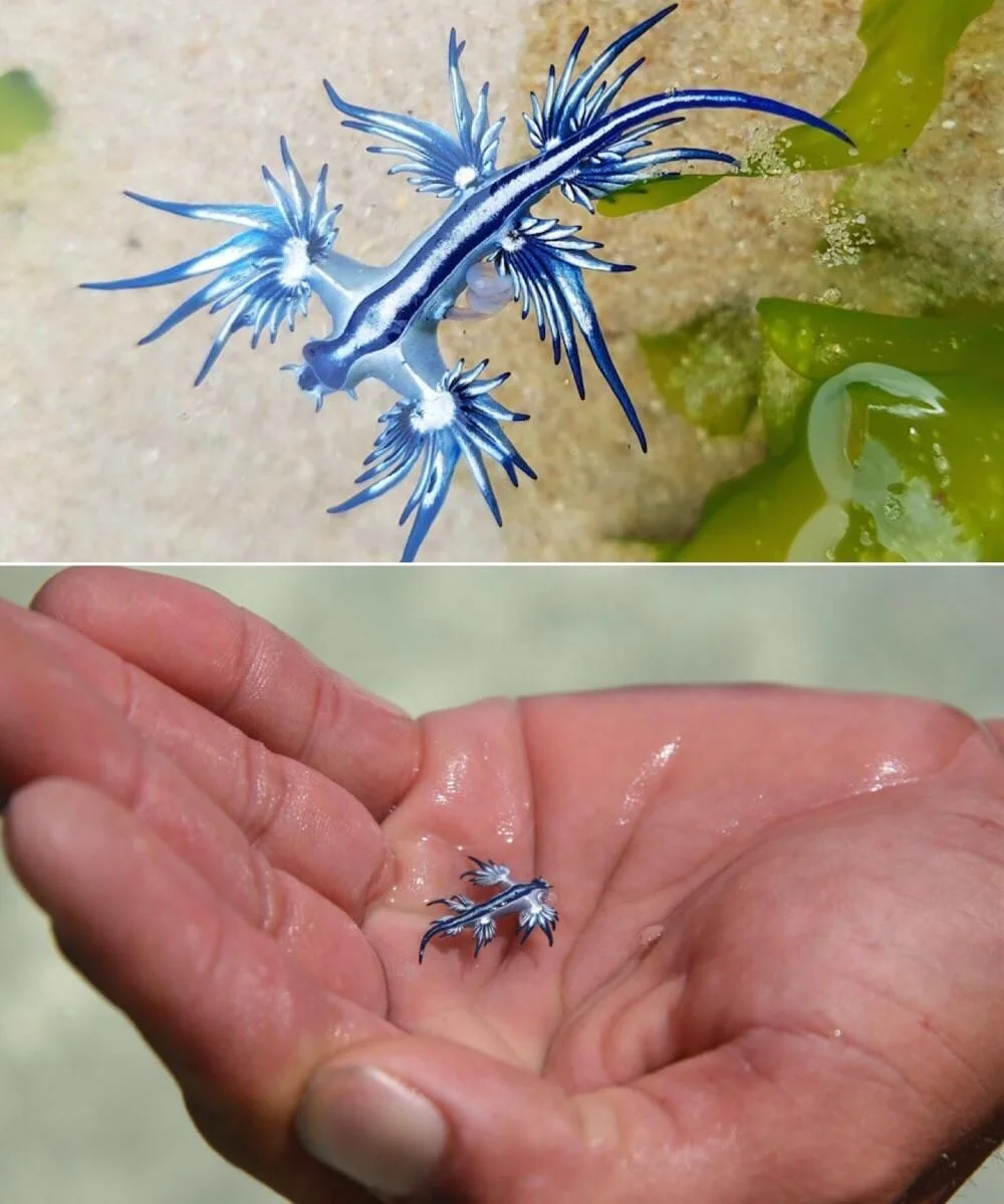 El “dragón azul”, identificado científicamente como Glaucus atlanticus, es un molusco marino que flota en la superficie del océano y suele ser arrastrado por corrientes y vientos. Aunque su tamaño es reducido, su coloración azul intenso lo hace visible tanto en el agua como en la franja de arena.