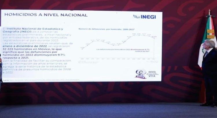 El mandatario destacó que los datos del INEGI sobre las cifras preliminares de homicidios durante el 2022, fueron de un total de 32 mil 223 homicidios en México, lo que representa una disminución.