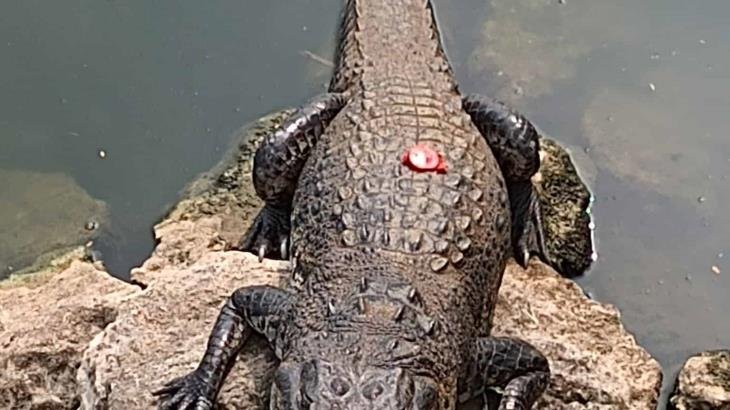 Un cocodrilo con una taparrosca en el lomo es algo que no se ve a diario. No obstante es una postal con la que se topó un visitante en la laguna de Las Ilusiones, en Villahermosa.