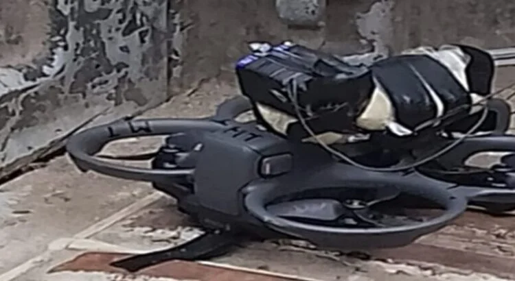 El dron con el explosivo intacto se encuentra en la vía pública, sin resguardo policial, cerca del centro del poblado, en la parte trasera de la escuela primaria local, lo que representa un grave riesgo para la población.