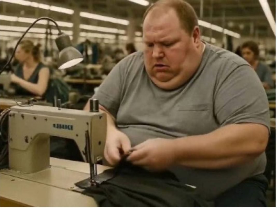 Los protagonistas del video son empleados con sobrepeso que trabajan en una fábrica textil; se les ve agotados y deprimidos mientras cosen ropa en máquinas de coser.