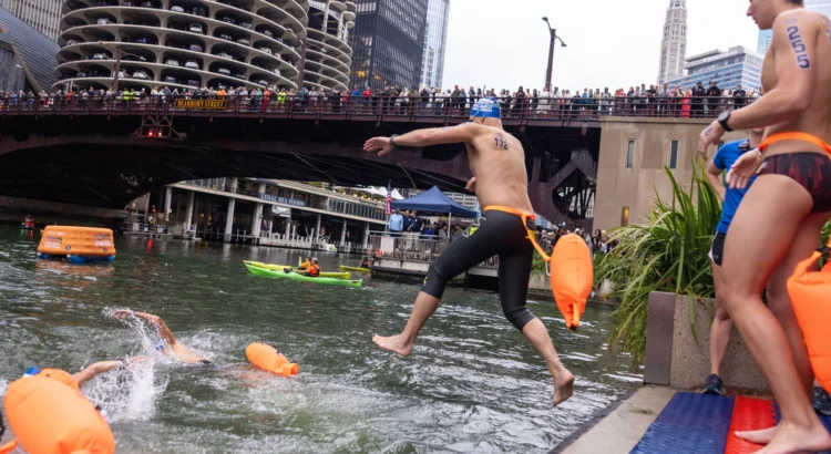 Alrededor de 300 nadadores se sumergieron en el río Chicago el domingo por la mañana para la primera natación en aguas abiertas organizada en casi un siglo, mientras los espectadores se alineaban en los puentes de Dearborn y Clark Street y en el Riverwalk.