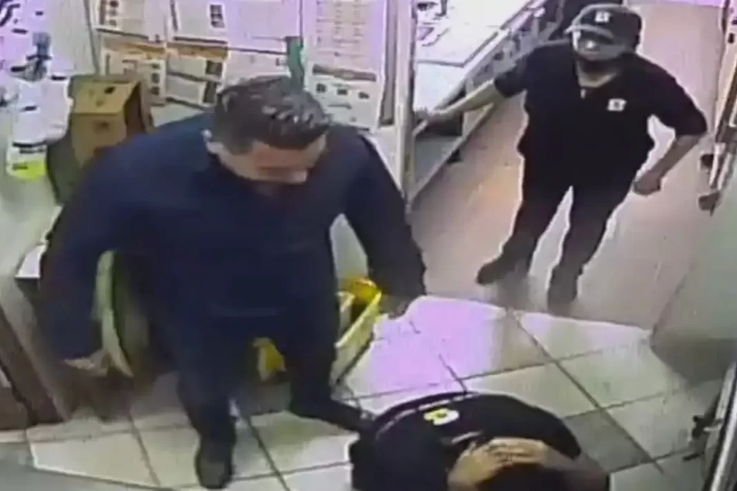 En la grabación, con fecha del 31 de julio, se ve que el hombre toma un respiro para poder derribar en el piso al joven con una patada. Aunque el empleado ya se encontraba en el suelo, el hombre siguió pegándole.