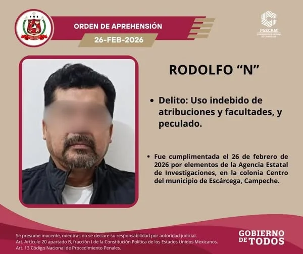El expresidente municipal de Escárcega, Rodolfo Bautista Puc, fue detenido este jueves, de acuerdo con el Registro Nacional de Detenciones, por su presunta responsabilidad en delitos relacionados con el manejo de recursos públicos.