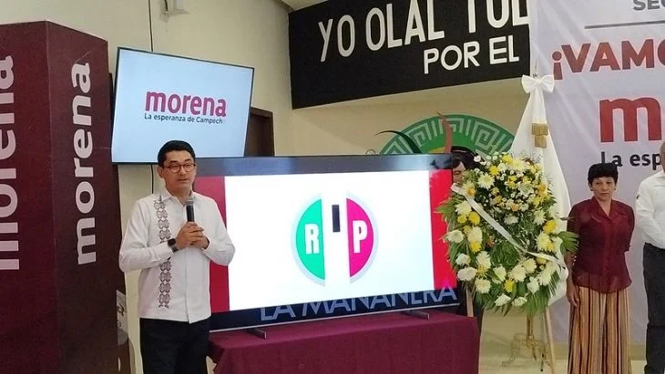 Antes de hablar sobre este tema, expuesto en el Martes del Jaguar de la gobernadora Layda Sansores, la dirigencia estatal de Morena conformada por Reyes León, y la ahora también diputada Elda Castillo, amenizaron con música de un cortejo fúnebre y colocaron una corona de flores a imágenes de Alito Moreno y al logo del PRI, recordando a un episodio del programa del año pasado.