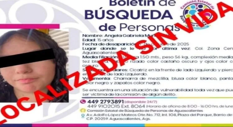 Ángela Gabriela Muñoz Téllez, una adolescente de 15 años que desapareció el pasado primero de octubre tras abordar un automóvil en la zona centro de la capital de Aguascalientes, fue encontrada sin vida en el municipio de Tequisquiapan, estado de Querétaro.