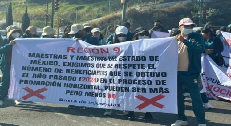 Docentes del Estado de México bloquearon las calles Lerdo e Hidalgo de Toluca, en su conexión con la avenida Adolfo López Mateos, para exigir que haya más presupuesto para el programa Promoción Horizontal 2025, el cual les da la posibilidad de obtener un incremento salarial.