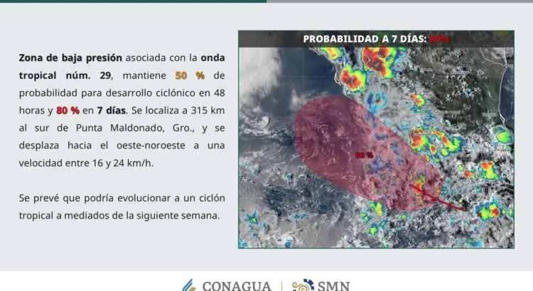 El Servicio Meteorológico Nacional (SMN) informó sobre una zona de baja presión asociada con la onda tropical número 29, ubicada frente a las costas del Pacífico mexicano, que mantiene 50 por ciento de probabilidad de desarrollo ciclónico en 48 horas y 80 por ciento en los próximos siete días.