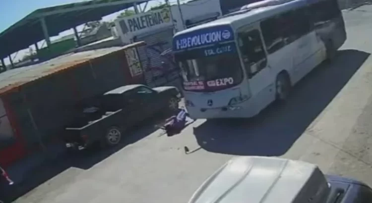 Cámaras de seguridad captaron el momento en el que una mujer cae aparatosamente de una unidad de transporte público en el área metropolitana de Monterrey.