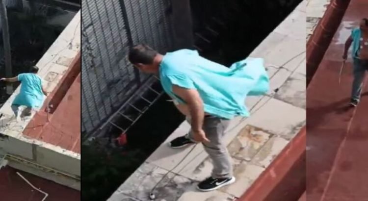 El hombre vestido con una bata verde, fue captado por las cámaras de videovigilancia, caminando por las esquinas de la azotea, presuntamente amenazaba con arrojarse al vacío