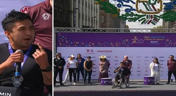 Durante la ceremonia de premiación, encabezada por la mandataria capitalina, el paratleta se acercó a Brugada, pidió el micrófono y denunció que, en la edición 2025 del maratón, dos competidores en silla de ruedas se cayeron debido a los baches localizados en la ruta.