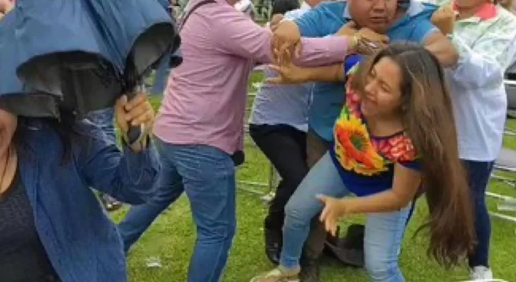 Mientras se desarrollaba la presentación, dos asistentes comenzaron un altercado a golpes que rápidamente escaló y en el cual salieron volando sillazos para evitar que las ocuparan como arma los involucrados, que de acuerdo con los videos se encontraban en estado de ebriedad, pues en esta celebración, a diferencia del acto oficial, se permite el consumo de bebidas alcohólicas, principalmente cervezas y mezcal.