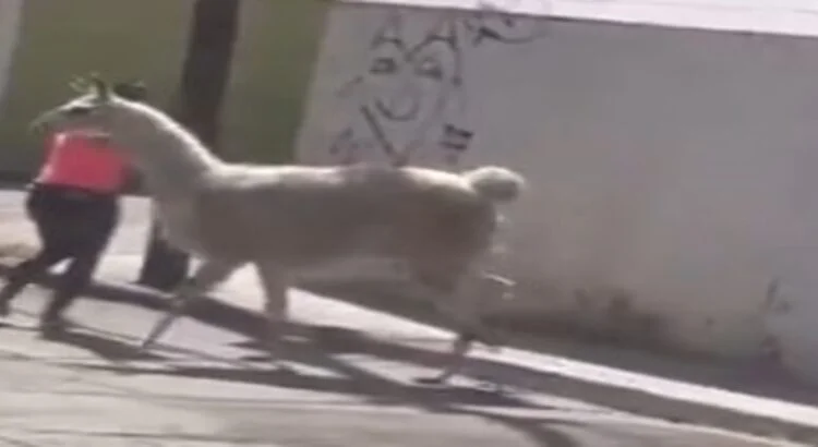 En el video, de apenas 14 segundos de duración, la mujer trata de conducir al animal con una correa sujetada al collar que tenía la llama en el pescuezo.